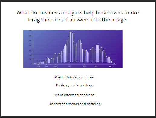 Used in practice and assessment questions, drag-and-drop allows the user to select different phrases, numbers, or images and identify or categorize them.